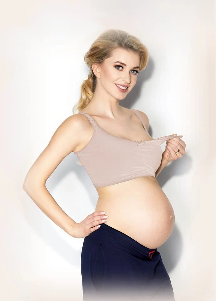 Biustonosz typu Top, idealny na okres ciąży, jak i okres karmienia. Świetnie się sprawdzi jako homewearowy top. Wykonany z miękkiej naturalnej bawełny zapewniającej komfort użytkowania. Idealnie dopasowuje się do kształtu zmieniających się piersi. Daje poczucie komfortu i wygody. Podczas laktacji umożliwia wygodne karmienie maluszka, dzięki łatwo odpinającym się miseczkom. Zapięcie typu Click-Clack umożliwia łatwe odpięcie jedną ręką.