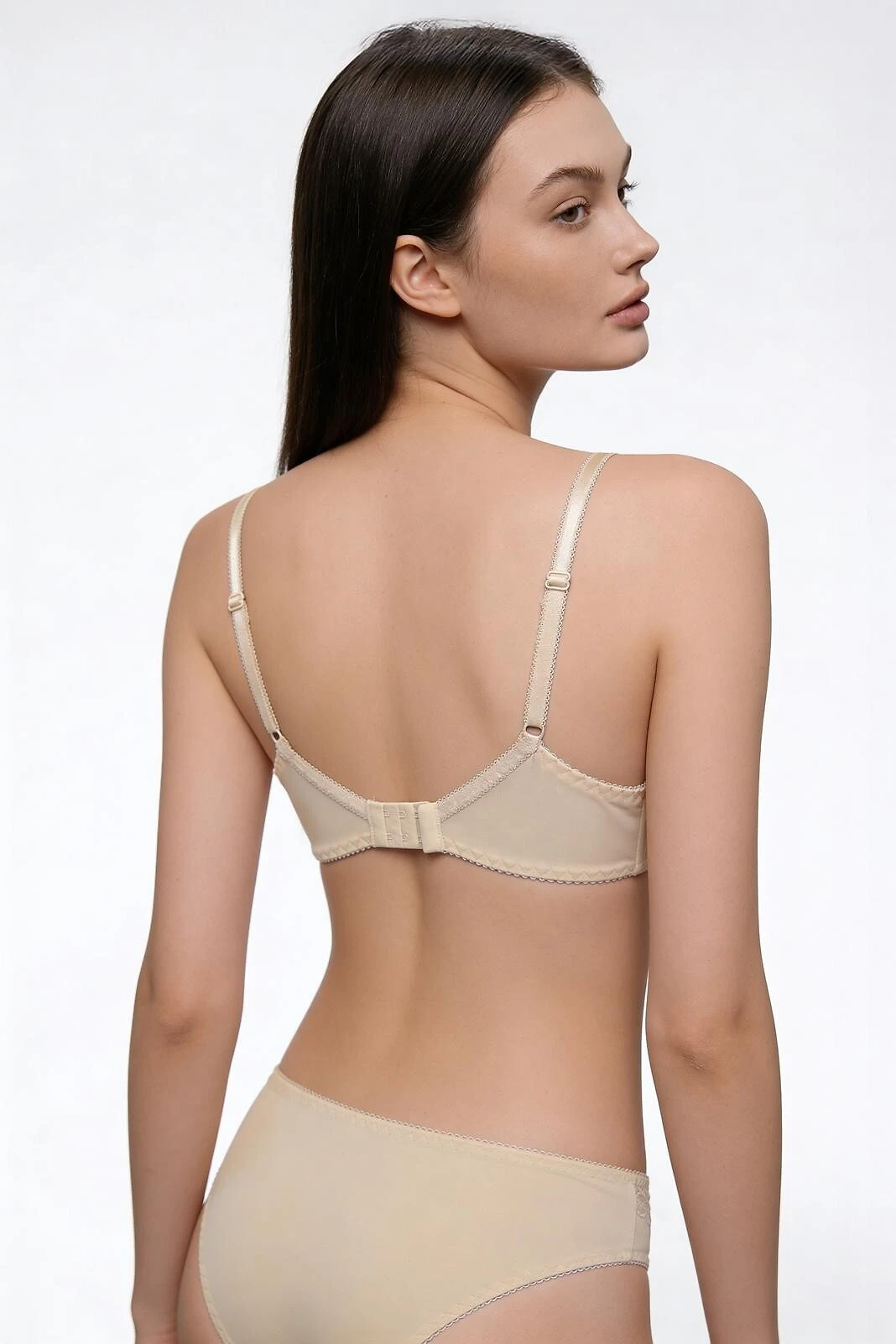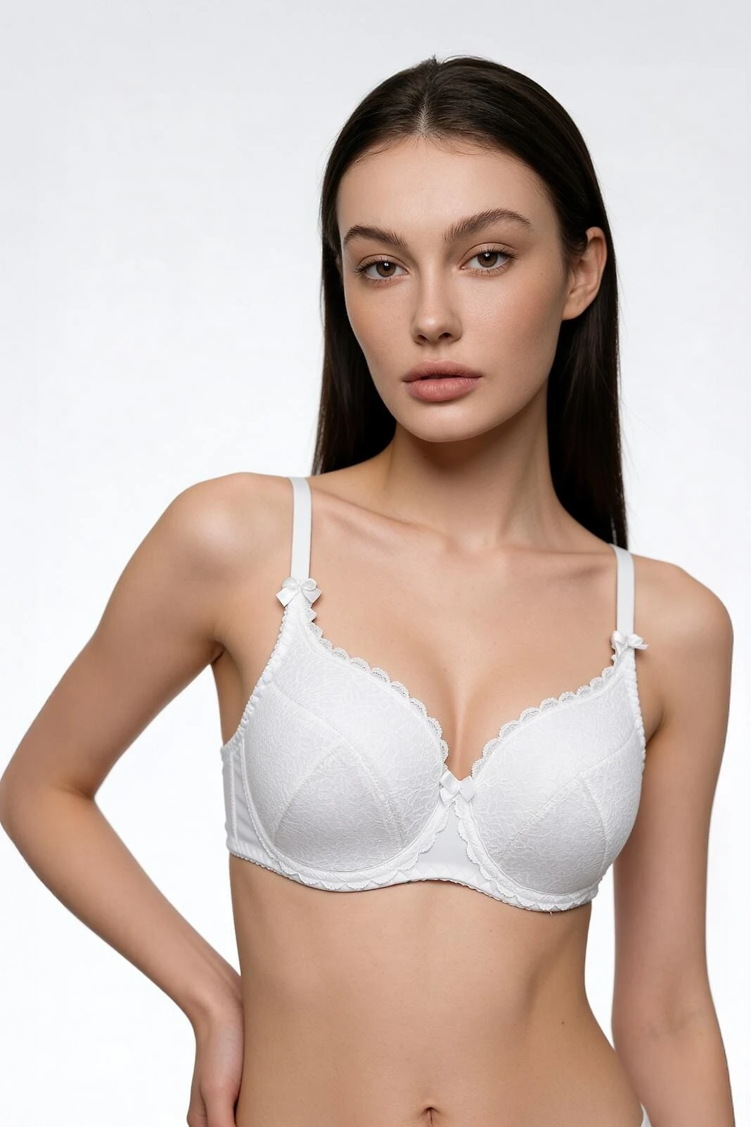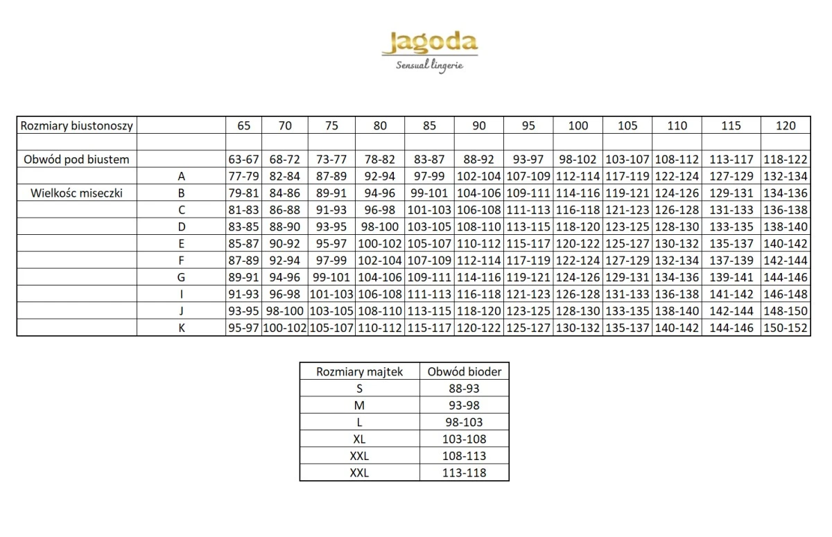 Biustonosz typu full cup- miseczki usztywniane, z fiszbinami- zdobione gęstą siateczką z kwiatowym haftem- krawędzie obszyte paskiem koronki- na łączeniu miseczek i przy ramiączkach satynowe kokardki- ramiączka regulowane, nieodpinane- obwód stabilny, z pionowymi fiszbinami po bokach- zapinany na dwie lub trzy haftki z trzystopniową regulacją- model dobrze zbiera i podtrzymuje biust Skład: 70% poliamid, 20% elastan, 10% bawełna Adres producenta: Przedsiębiorstwo Produkcyjno-Handlowe "JAGODA" Marian Kowal 46-211 Krzywizna ul.Orkana 7 NIP: 751-108-53-66 TEL.