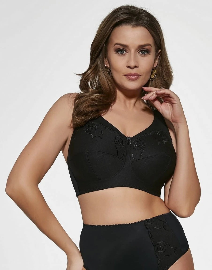 Komfortowy biustonosz dla Pań z większym, pełnym biustem. Miękki, bardzo wygodny w noszeniu, dobrze zbierający biust. W górnej linii zdobiony efektownym haftem o kwiatowym motywie, na łączeniu miseczek satynowa kokardka. Wygodne szerokie ramiączka zapewniające komfort podczas noszenia.