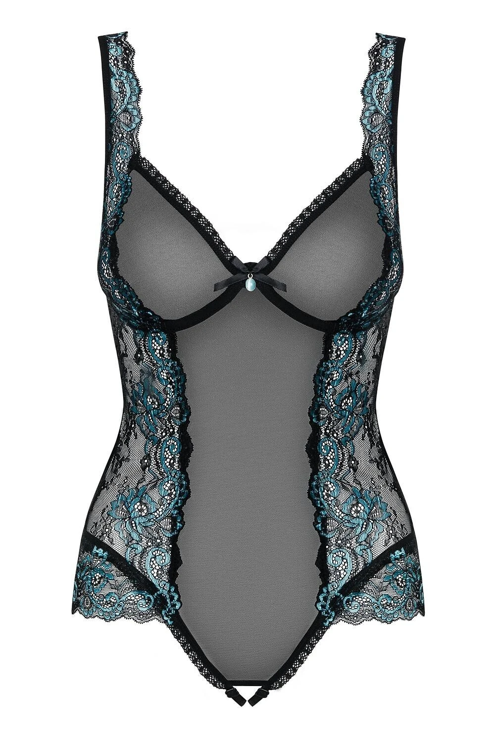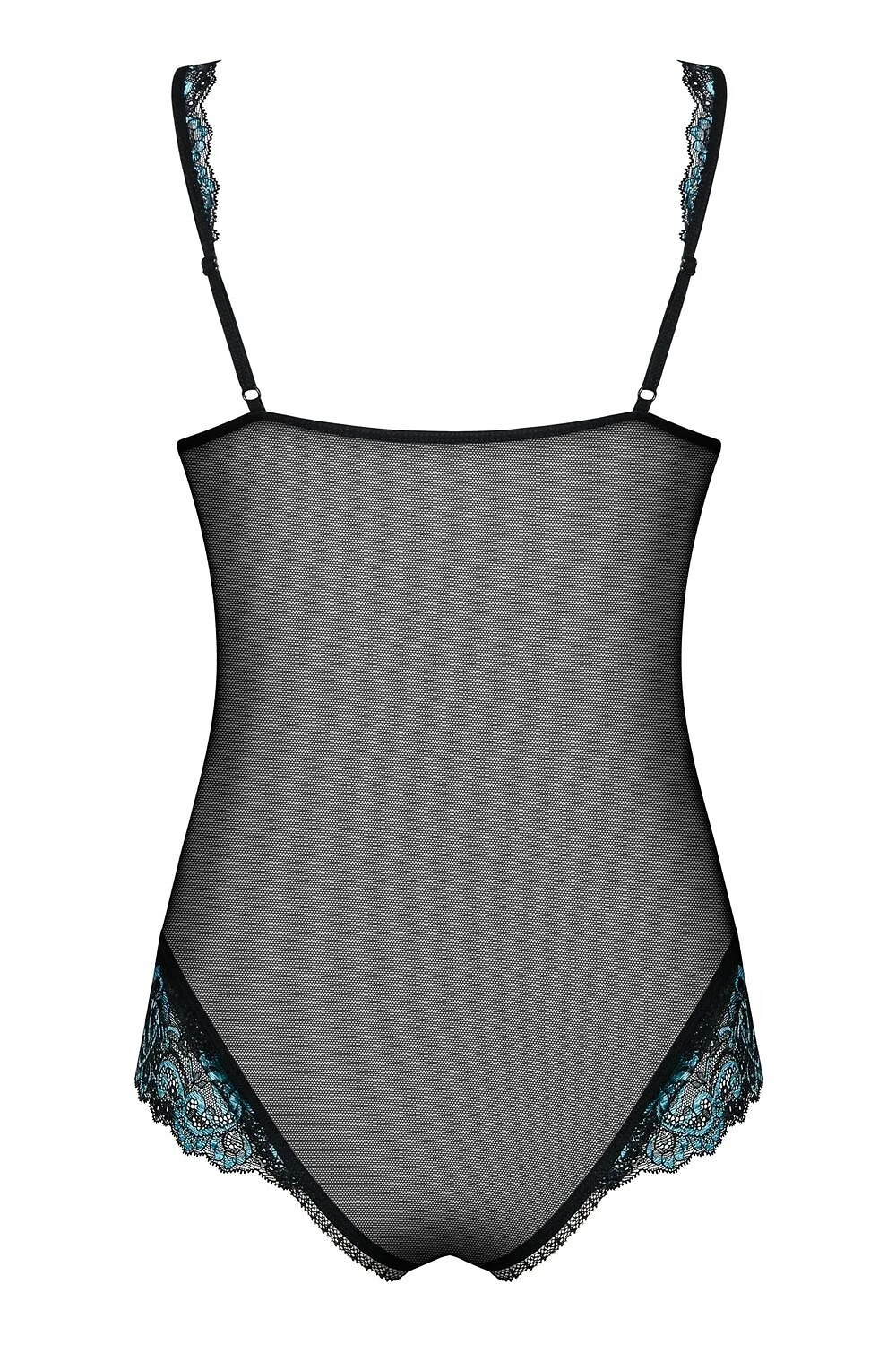 Seksowne body- z prześwitującej siateczki i koronki zdobionej turkusowym wzorem- miseczki miękkie z fiszbinami- ramiączka z regulacją- tył z tiulowej siateczki- otwarty krok z regulowanymi paseczkami Skład: 94% poliamid, 6% elastanAdres producenta: AMOCARAT SP. Z O.
