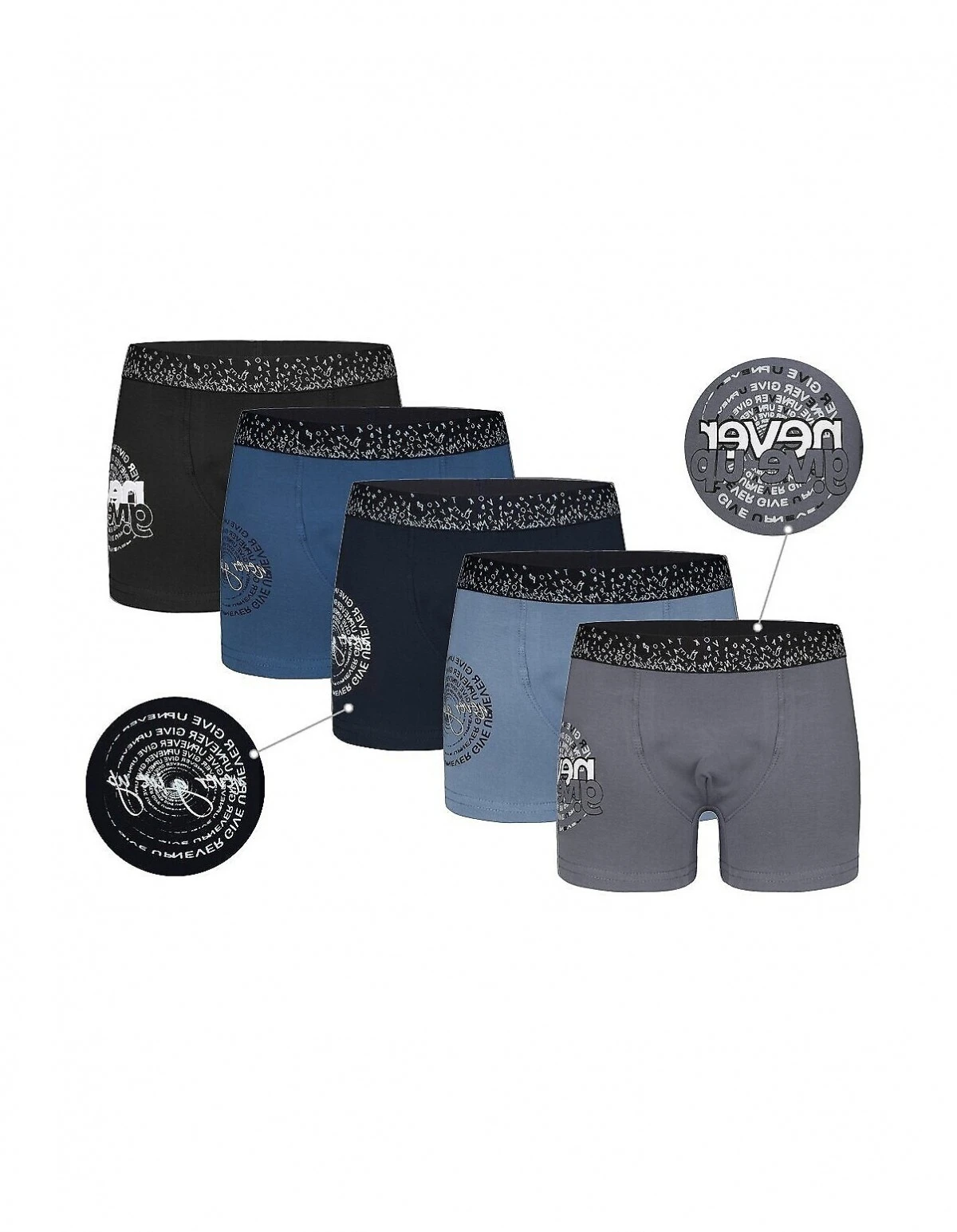 Bawełniane bokserki chłopięce- w pasie szeroka, ozdobna guma - bezuciskowe wykończenie nogawek- bok ozdobiony nadrukiem- doskonale przylegają do ciała- pakowane w foliowy woreczek- dostępne kolory wybierane losowo: granatowy, jeans, niebieski, szary, czarny Skład: 95% bawełna, 5% elastanAdres producenta: Donella SP.Z O.