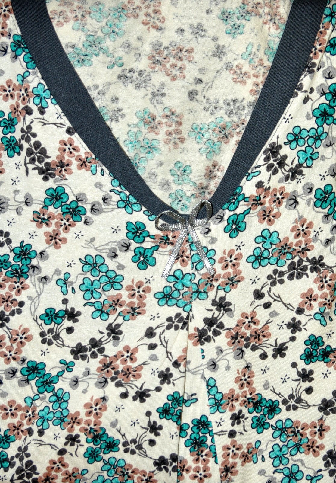 Koszula damska z krótkim rękawkiem. Wykonana z miłej w dotyku wiskozy ozdobionej wzorem w kolorowe kwiaty. Dekolt w kształcie litery "V" z satynową kokardką.
