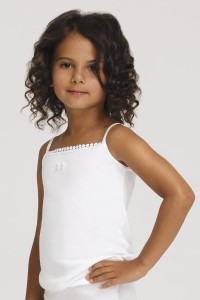 Koszulka dziewczęca z wysokiej jakości bawełny. Wąskie ramiączka, dekolt obszyty delikatna koronką o różnorodnym wzorze.