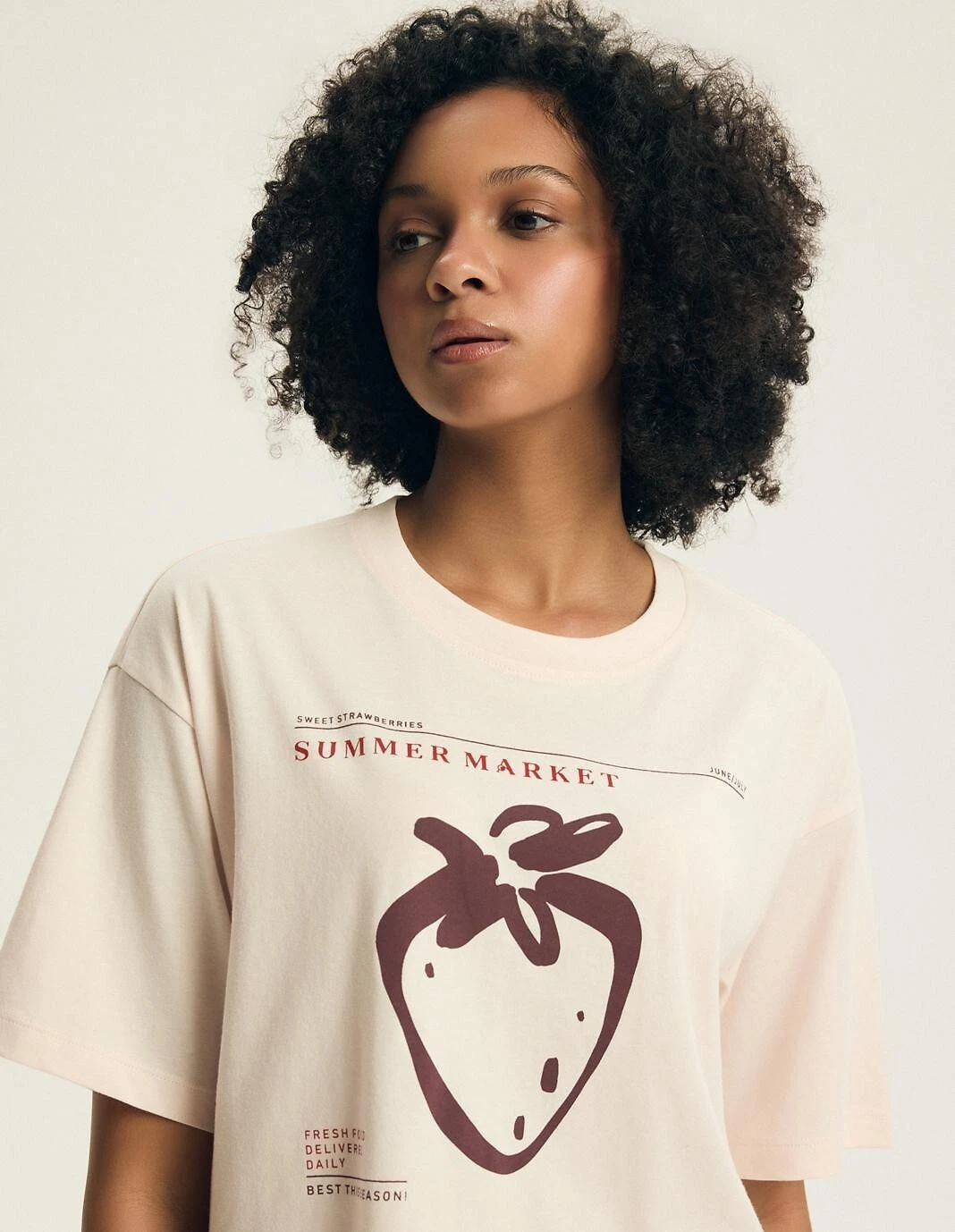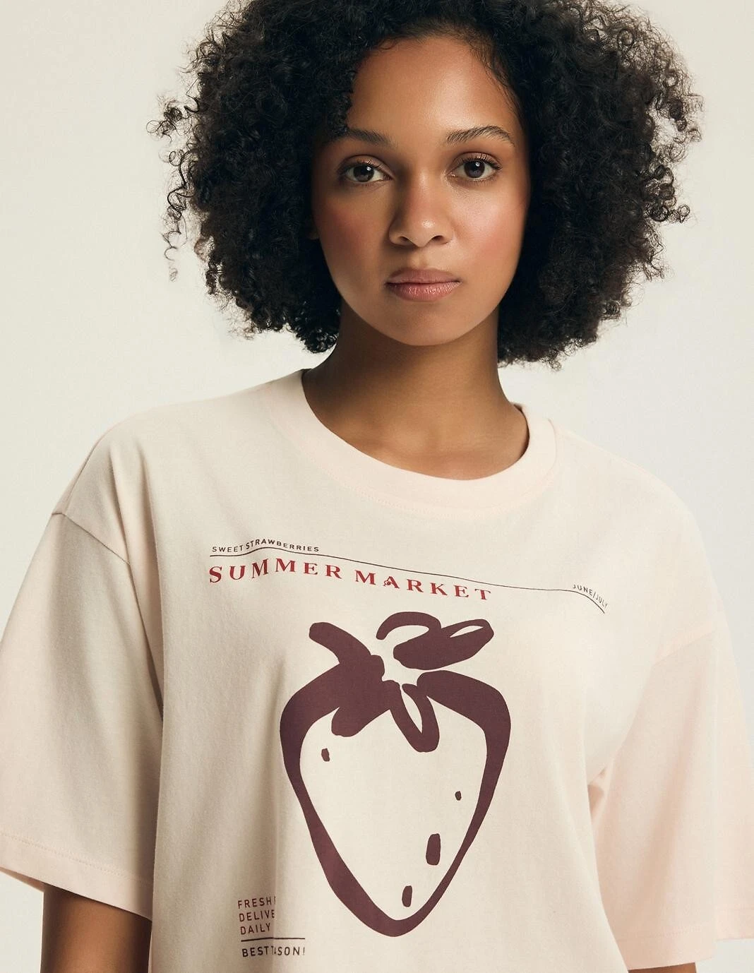 Letnia piżama damska- wysokiej jakości bawełna- krótsza koszulka z krótkim rękawem- z przodu print w truskawki- dekolt okrągły- w komplecie krótkie, wzorzyste szorty- szeroki prążkowany pas z troczkami do regulacji obwodu- pakowana w foliowy worek Skład:100% bawełnaAdres producenta: LPP S.A.