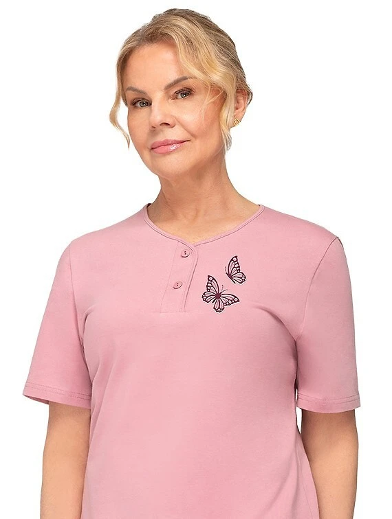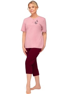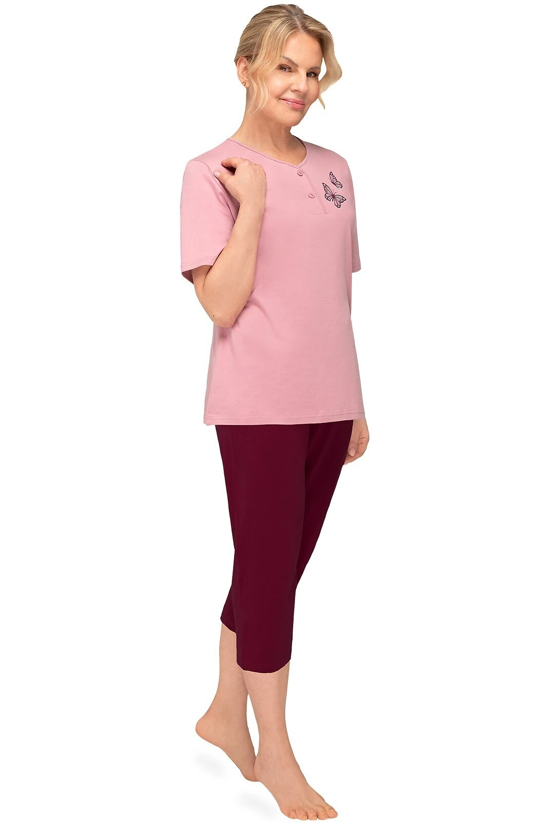 Piżama damska- z przyjemnej, miękkiej bawełny- koszulka z krótkim rękawem - efektowny dekolt "V" zapinany na dwa guziczki- na wysokości piersi nadruk z motylkami- spodnie w kontrastującym kolorze, długość 3/4- pakowana w foliowy worek Skład: 100% bawełnaAdres producenta: P.P.