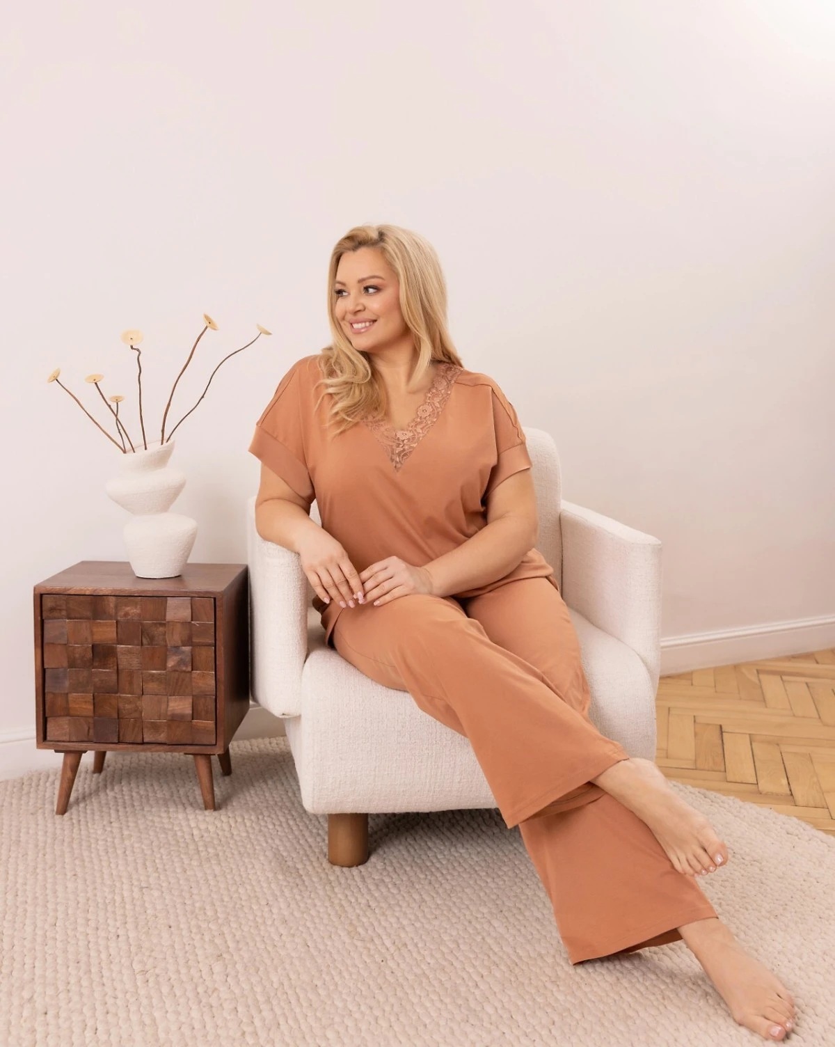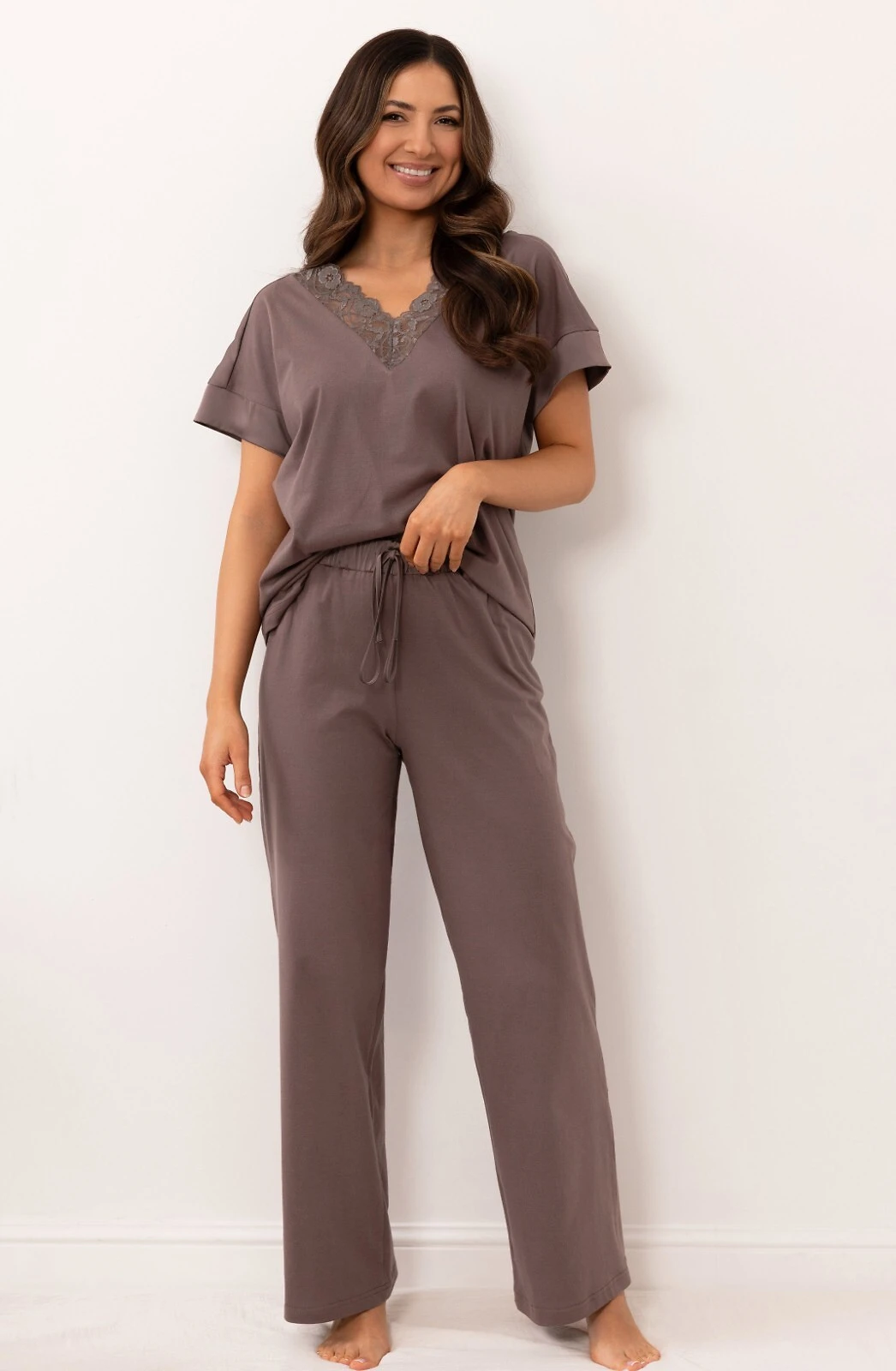 Piżama damska- wysokiej jakości bawełna- koszulka z krótkim rękawem- gładka, jednolita- dekolt V obszyty koronką- ramiona i rękawy ozdobione wstawką satyny- do kompletu długie spodnie- pas obszyty satyną z troczkiem do wiązania kokardki Skład: 100% bawełnaAdres producenta: "REGINA" 90-418 Łódź ul.Kościuszki 23/25 NIP: 728-012-86-14 TEL: 042 636-37-97 / 042 637-20-57 E-MAIL: office@reginasocks.