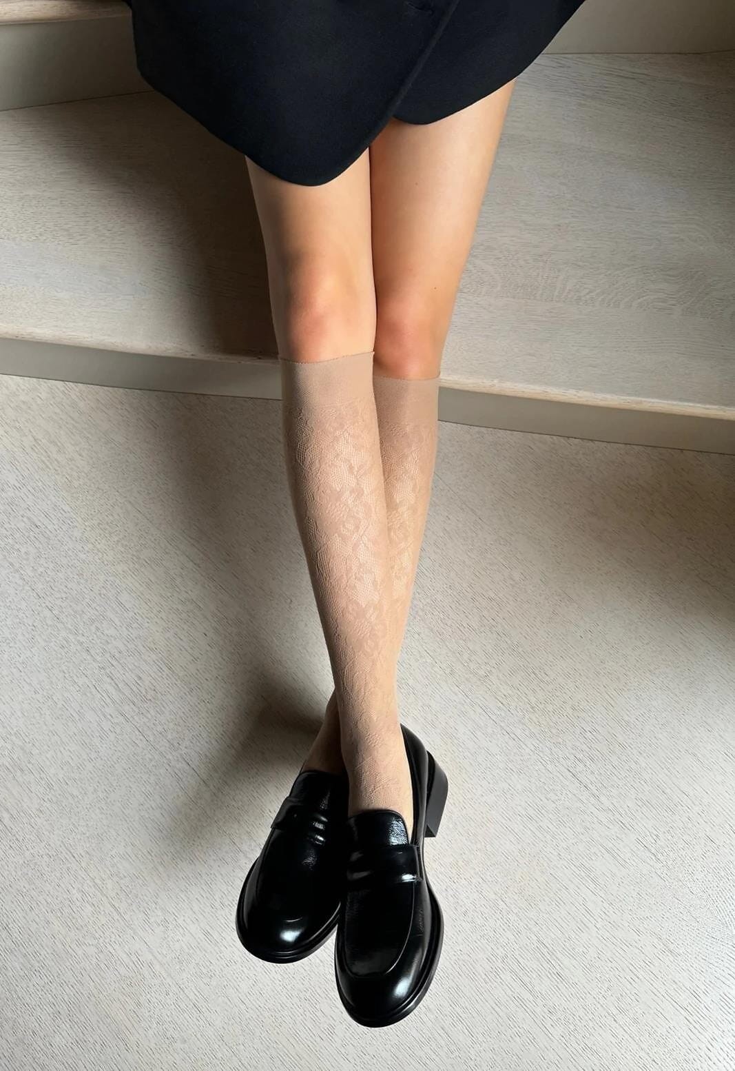Podkolanówki damskie - miękka, ażurowa dzianina - kwiatowy wzór - bez zaznaczonych wzmocnień na palcach - wygodny, nieuciskający ściągacz Skład: 90% poliamid, 10% elastan.