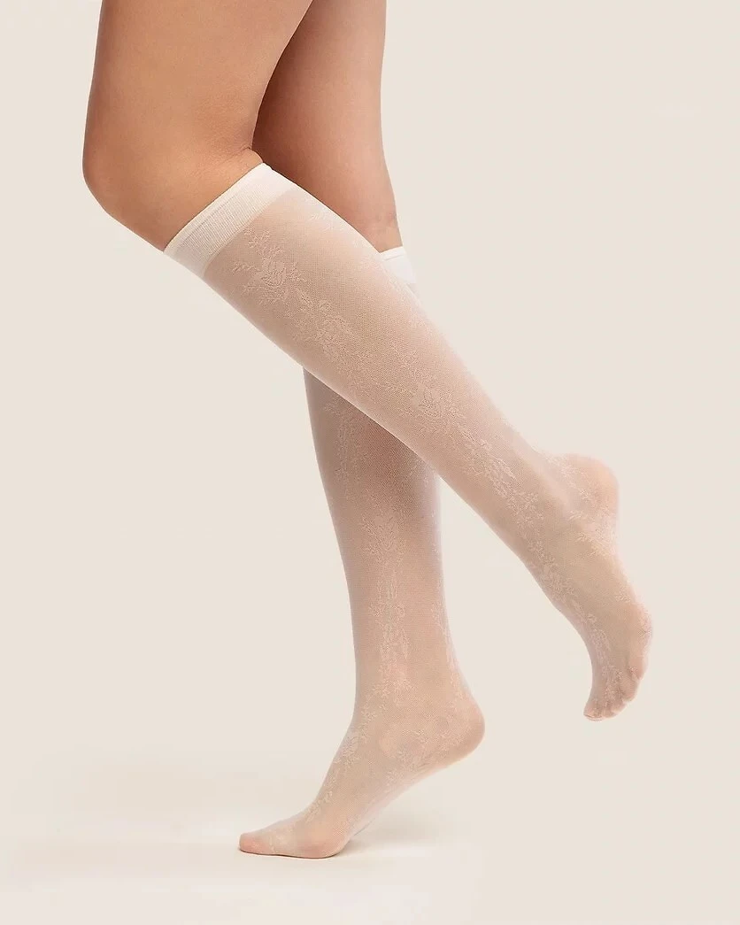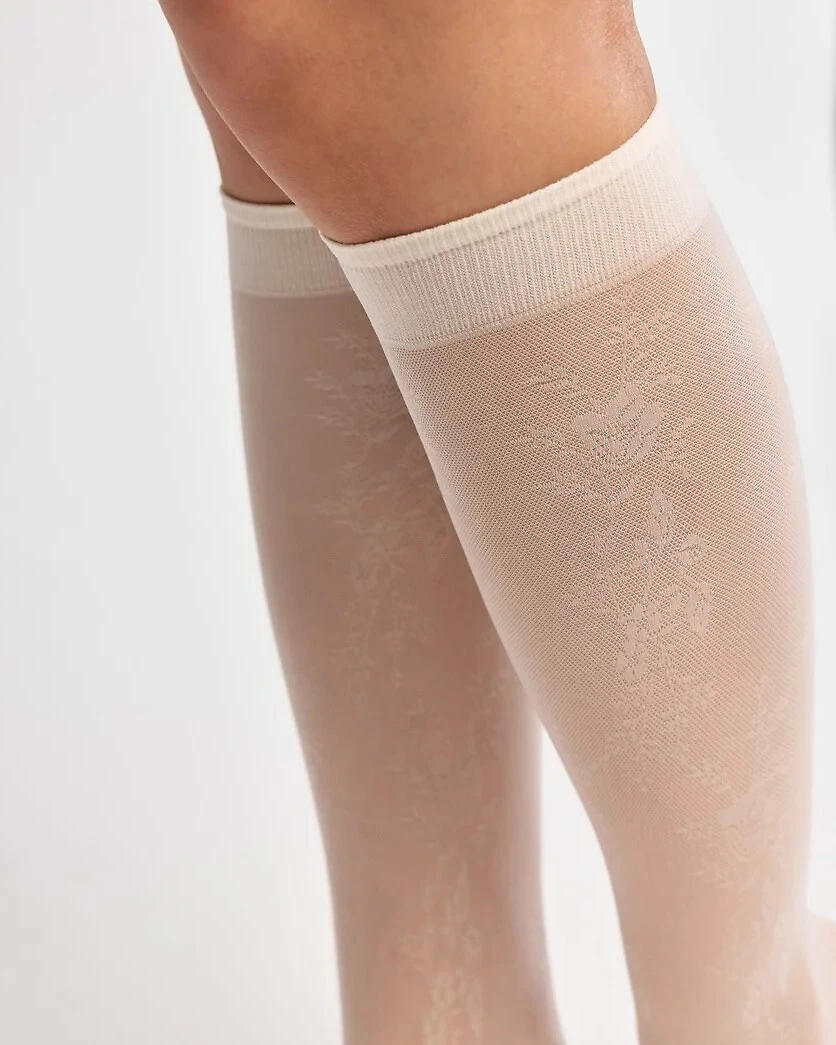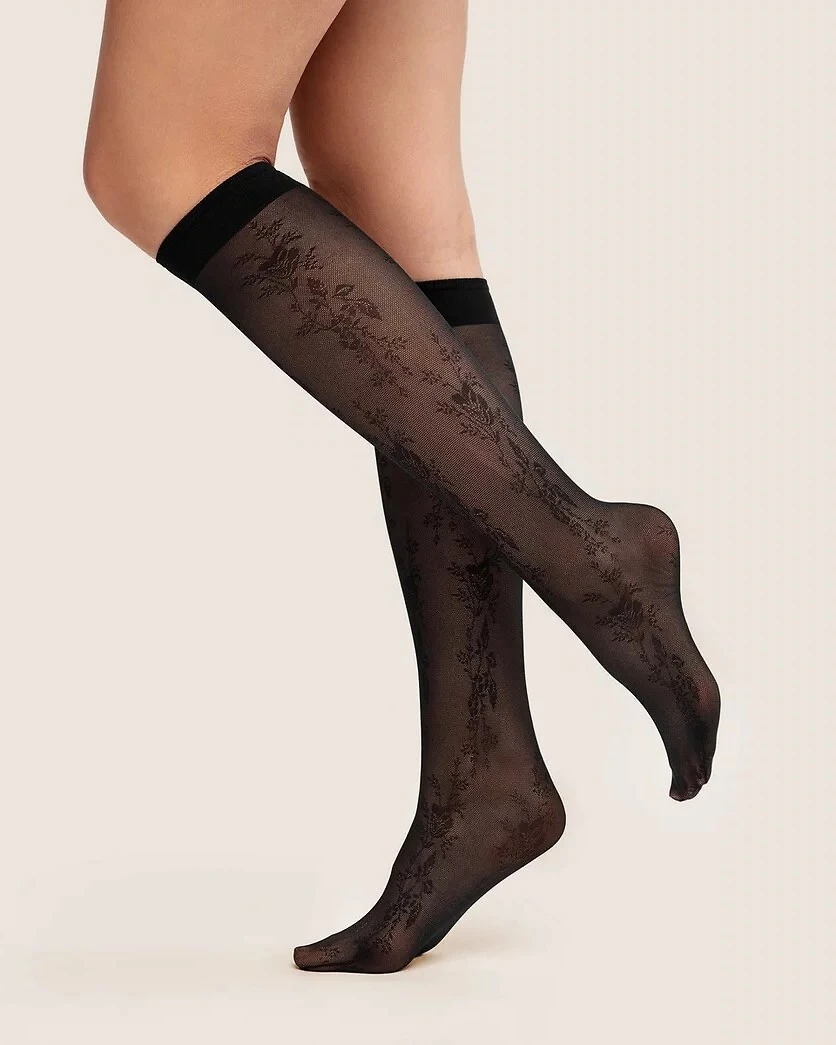 Cienkie podkolanówki damskie- ozdobione efektownym wzorem- nieuciskający ściągacz- brak zaznaczonych wzmocnień na palcach Skład: 85% poliamid, 15% elastanAdres producenta: GABRIELLA D.B.