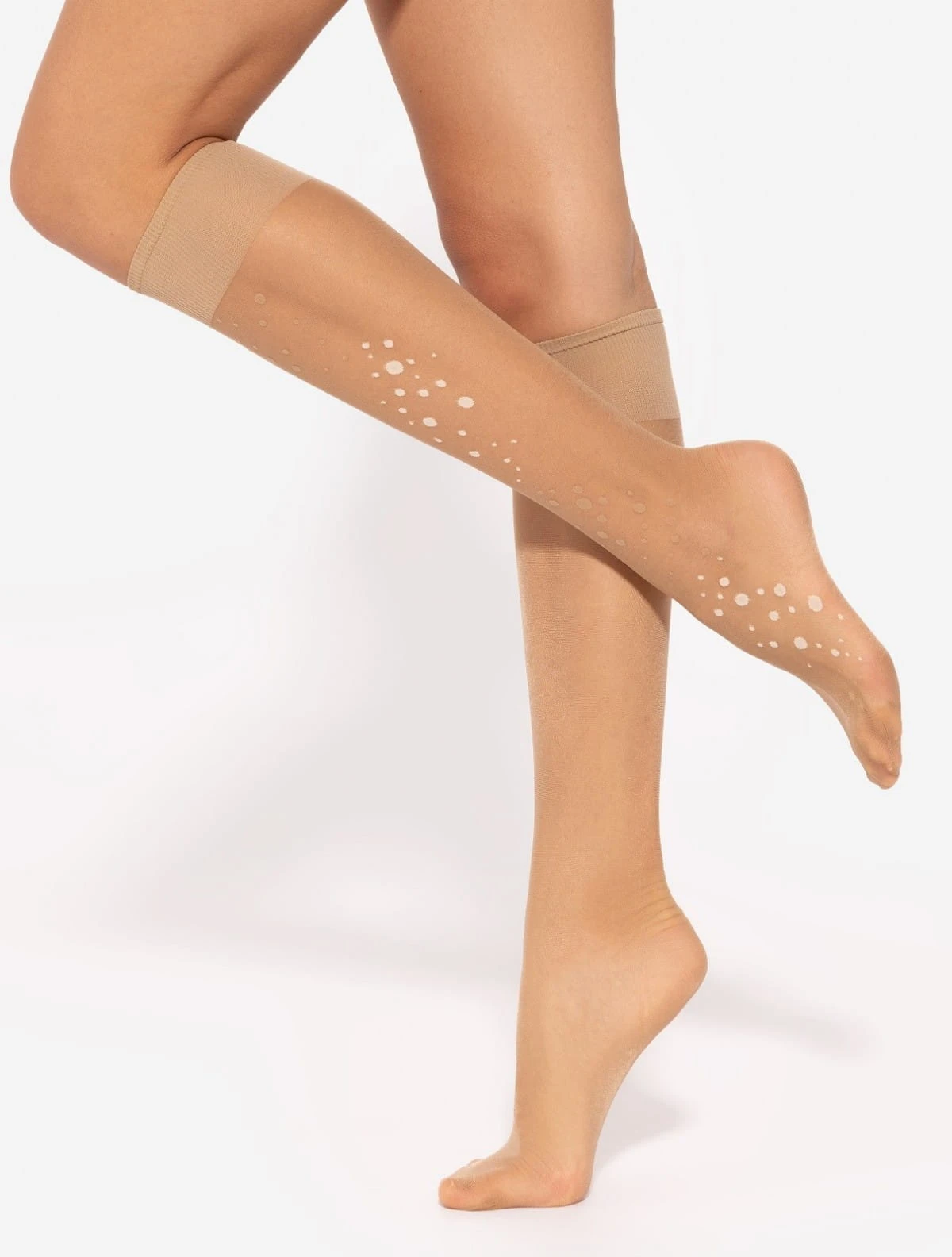 Wzorzyste podkolanówki damskie - grubość 20 den - wzmocnione palce - nieuciskający ściągacz Skład: kolor nero: 92% poliamid, 8% elastan; kolor daino-beige: 89% poliamid, 8% elastan, 3% polipropylen.