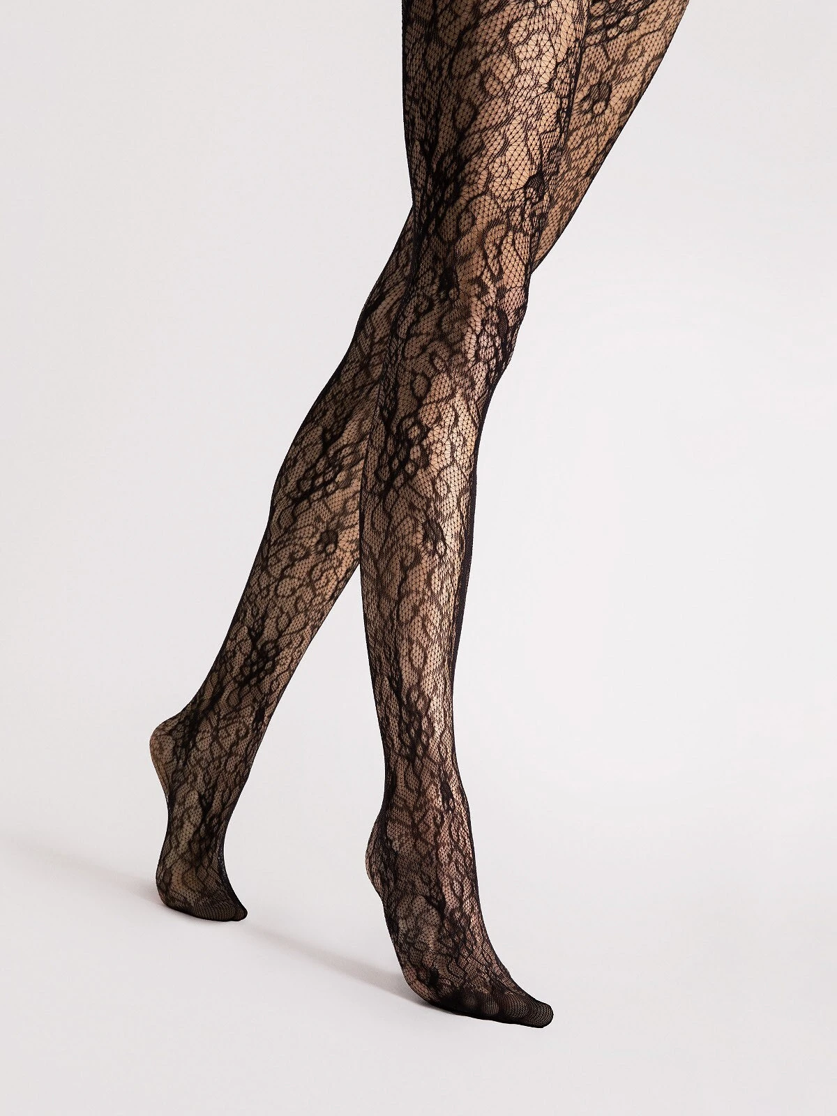 Efektowne rajstopy- o siateczkowym splocie- ozdobione wzorem- bez zaznaczonej części majteczkowej i wzmocnień na palcach- z klinem Skład: 85% poliamid, 15% elastan Adres producenta: FIORE Sp. Jawna ul.