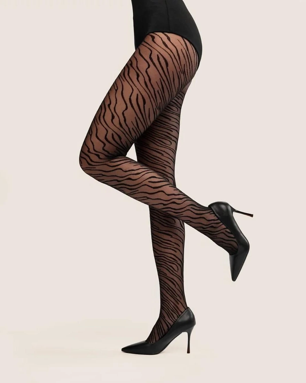 Rajstopy damskie- elastyczne włókno podwójnie oplecione jedwabiem poliamidowym- grubość 20 den- dynamiczny, zwierzęcy print- niewidoczne wzmocnienie na palcach- bez wydzielonej części majteczkowej- płaskie szwy, bawełniany mały klin Skład: 84% poliamid, 15% elastan, 1% bawełnaAdres producenta: GABRIELLA D.B.