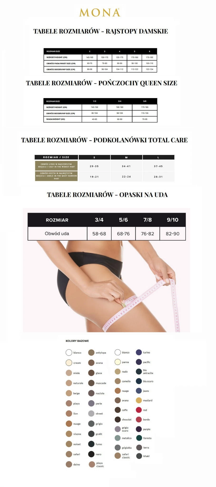 Rajstopy relaksująco-zdrowotne 40 den. Dzięki specjalnemu doborowi włókien podnoszona jest trwałość rajstop, dająca stopniowy ucisk, który czyni nogi smuklejszymi i może zapobiegać cellulitowi i powstawaniu żył powierzchniowych.