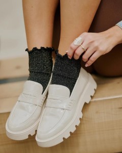Skarpetki damskie- miękka, kryjąca dzianina w prążek- z połyskującą nitką lurex- ścigacz zakończony falbanką- płaskie szwy Skład: 80% poliamid, 17% przędza metalizowana, 3% elastan Adres producenta: GABRIELLA D.B.