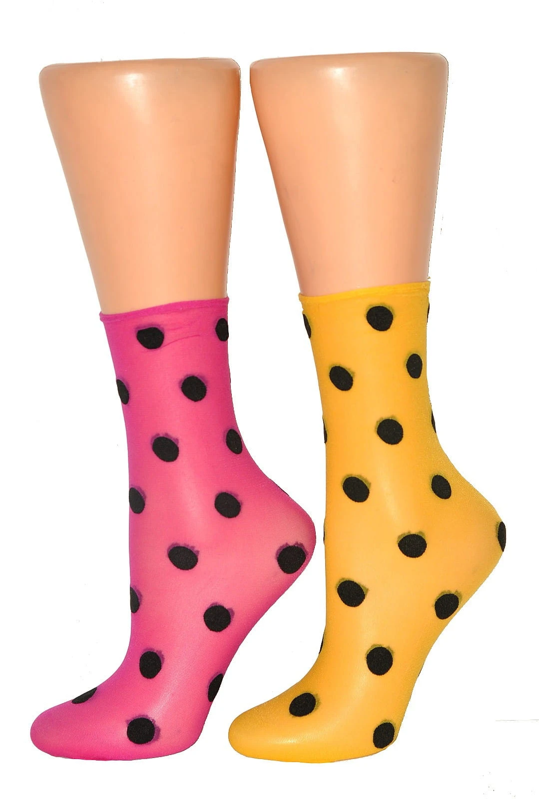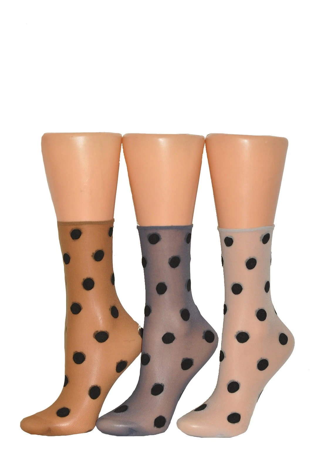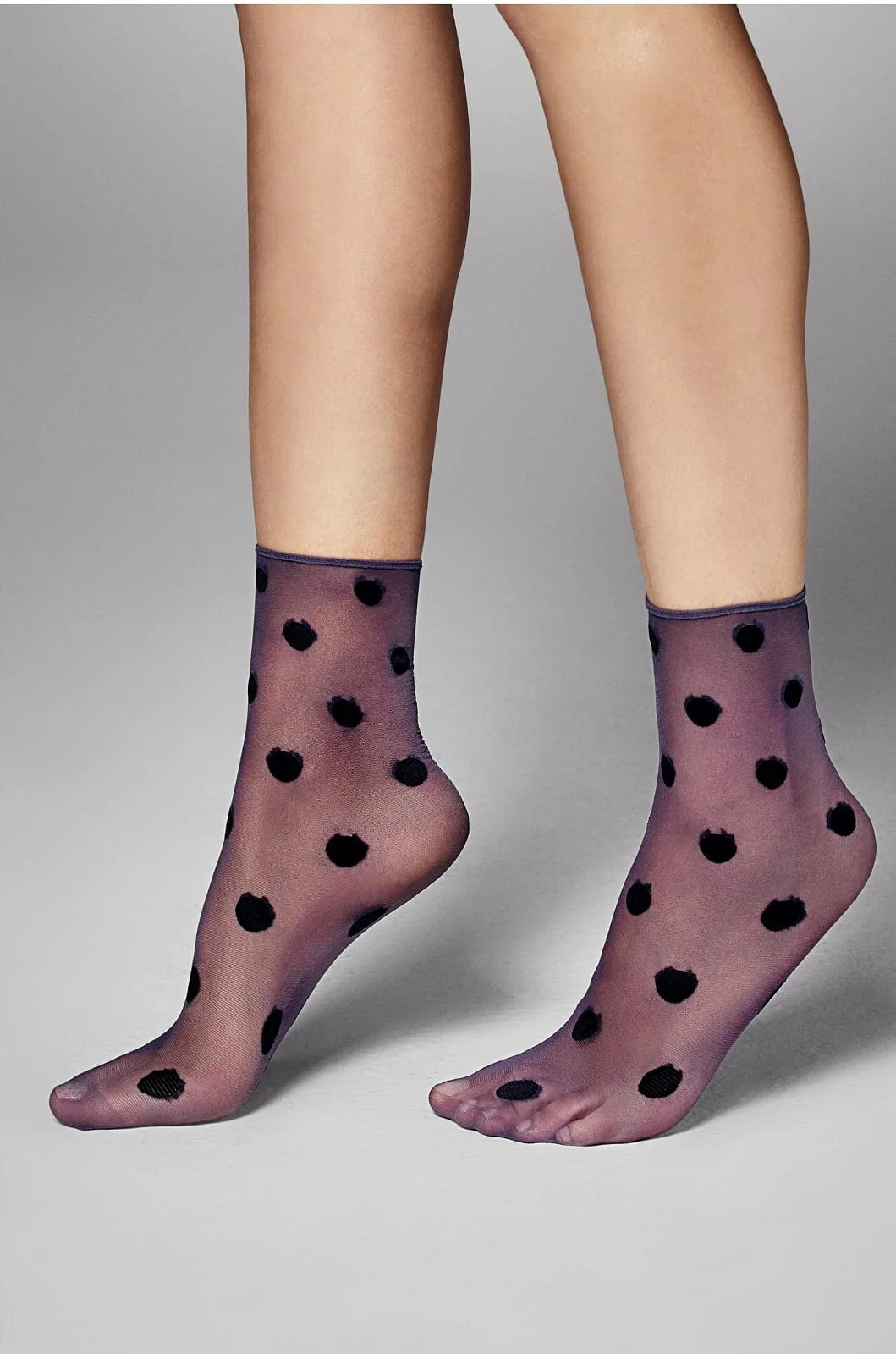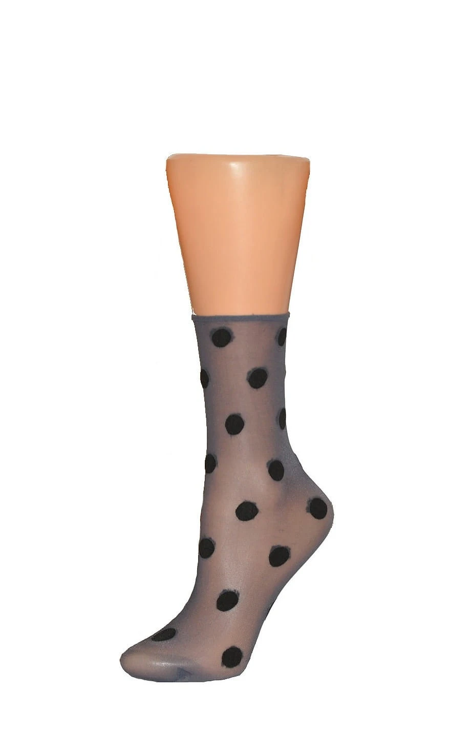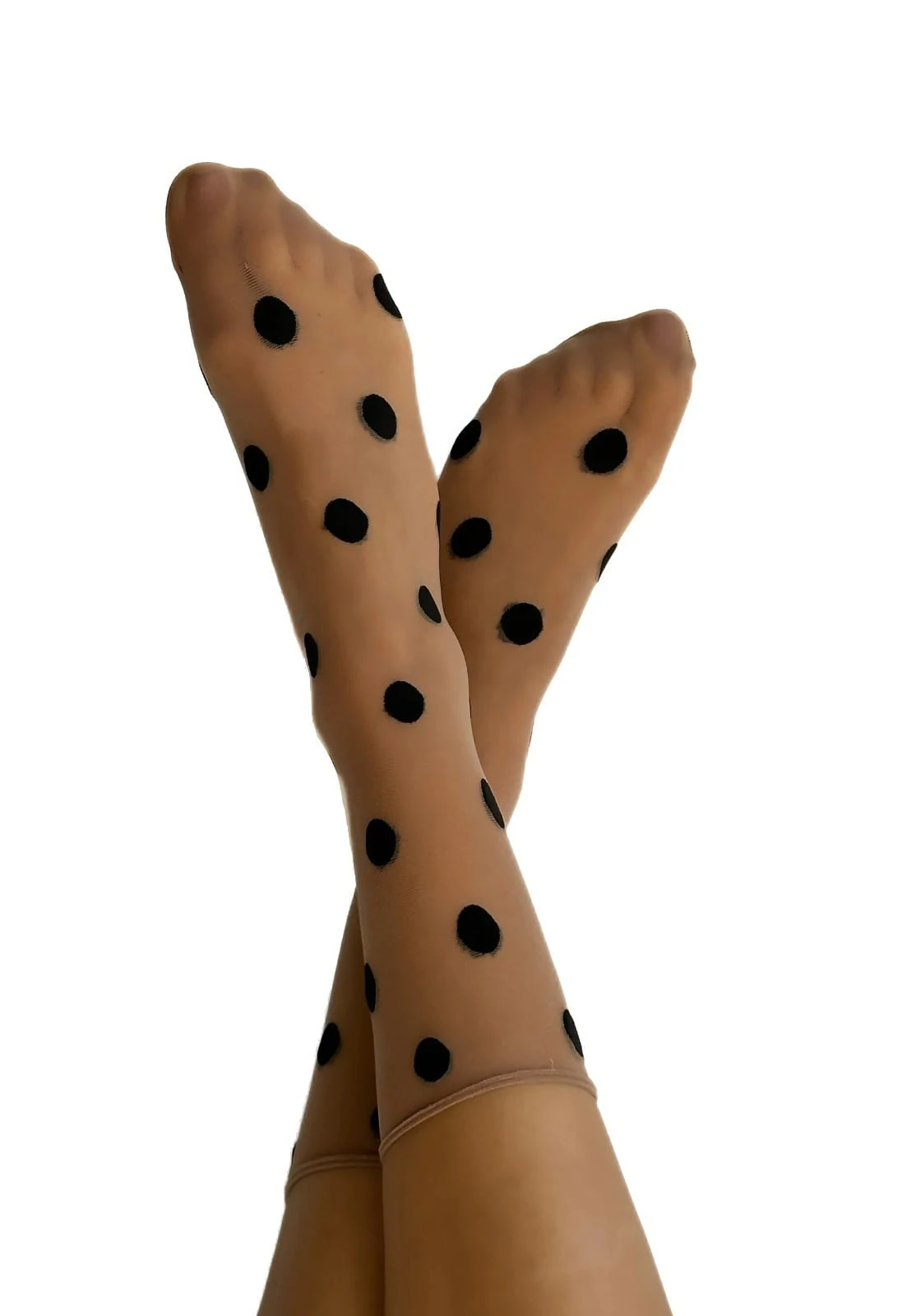 Cienkie, aksamitne w dotyku skarpetki damskie z nieuciskającym delikatnym ściągaczem. Ozdobione wzorem w duże grochy.