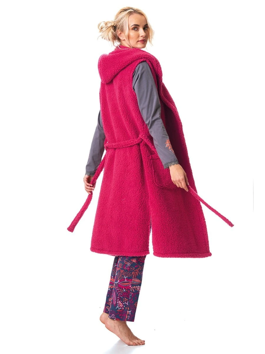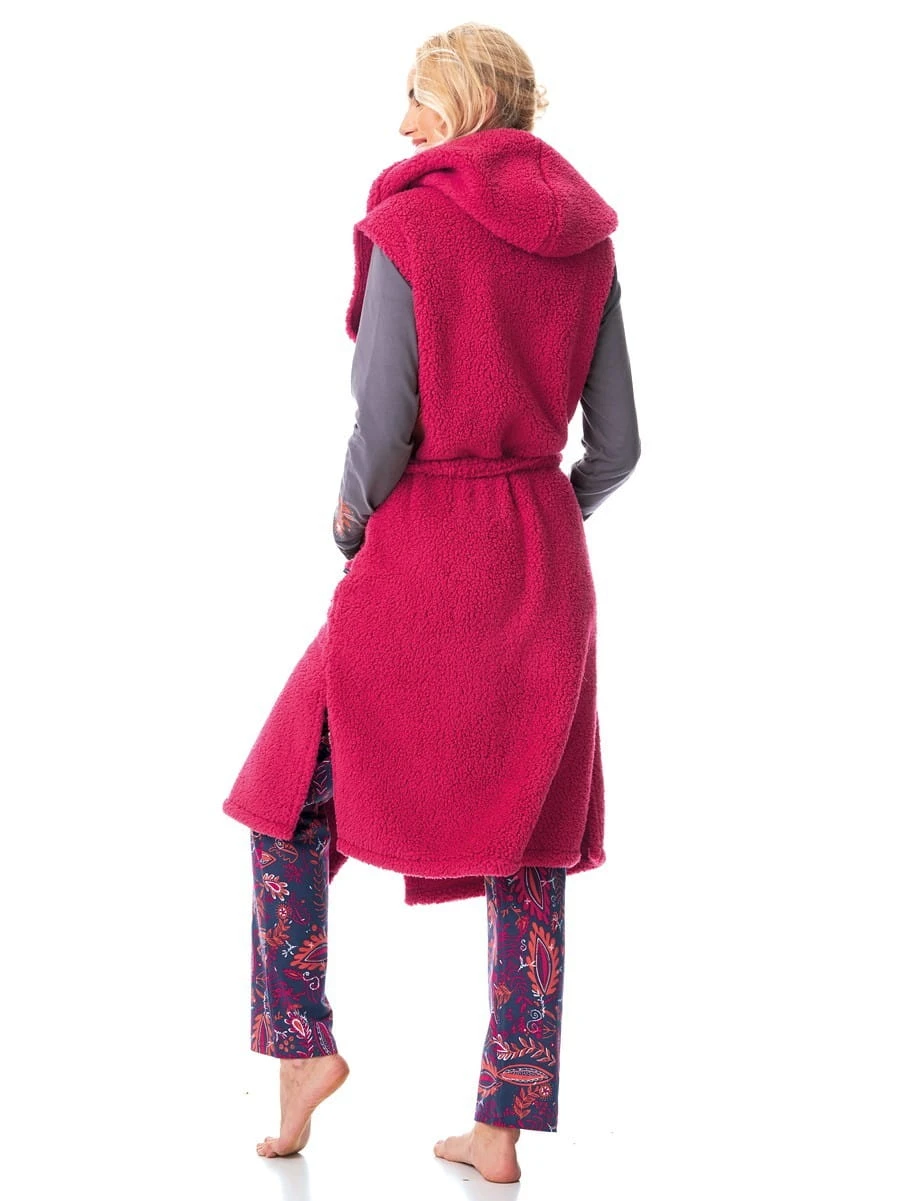 Długa kamizelka damska-homewear - dwustronnie miękka dzianina - z kapturem, wiązana w pasie - dwie zewnętrzne kieszenie - idealna na chłodne wieczory Skład: 100% poliester .