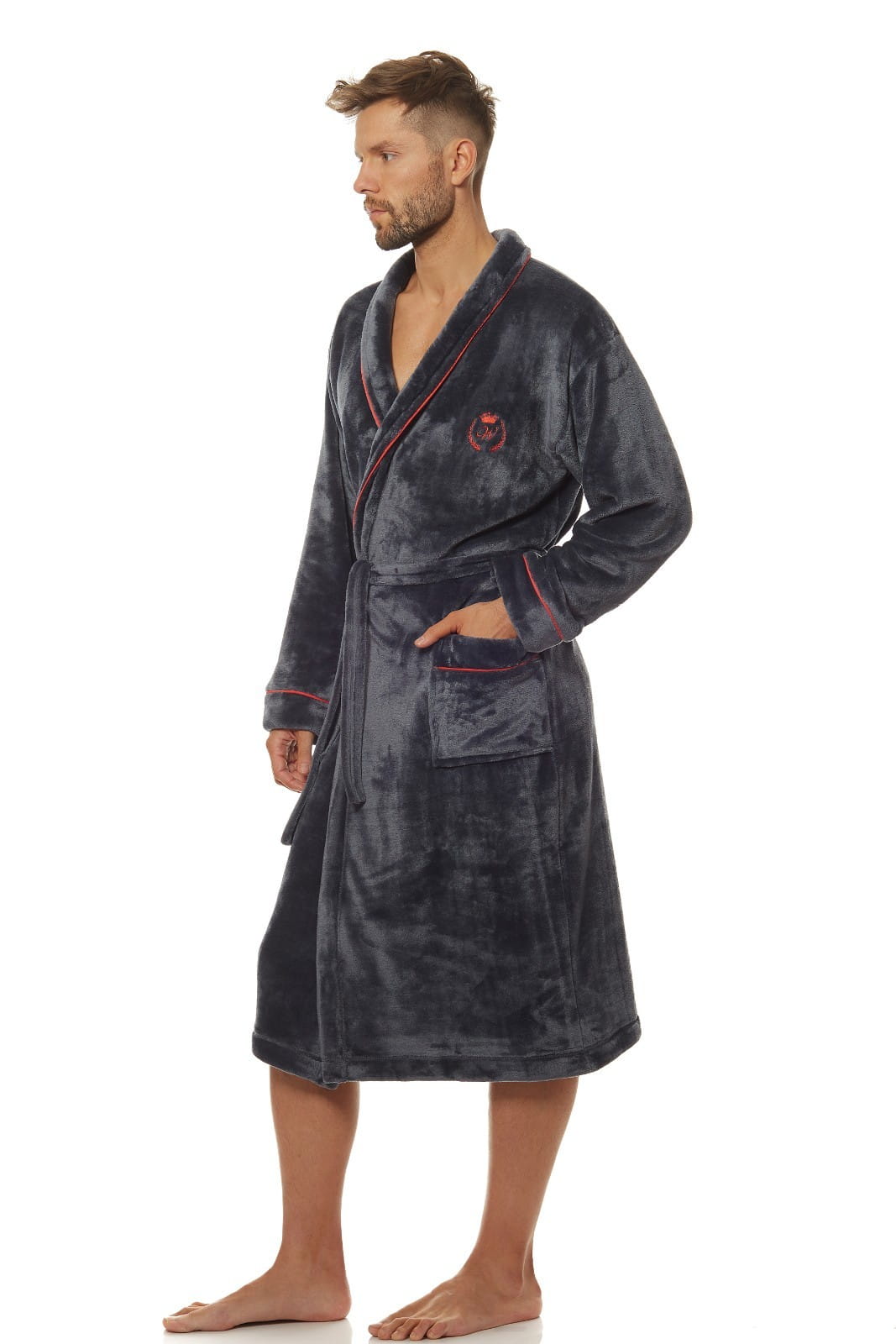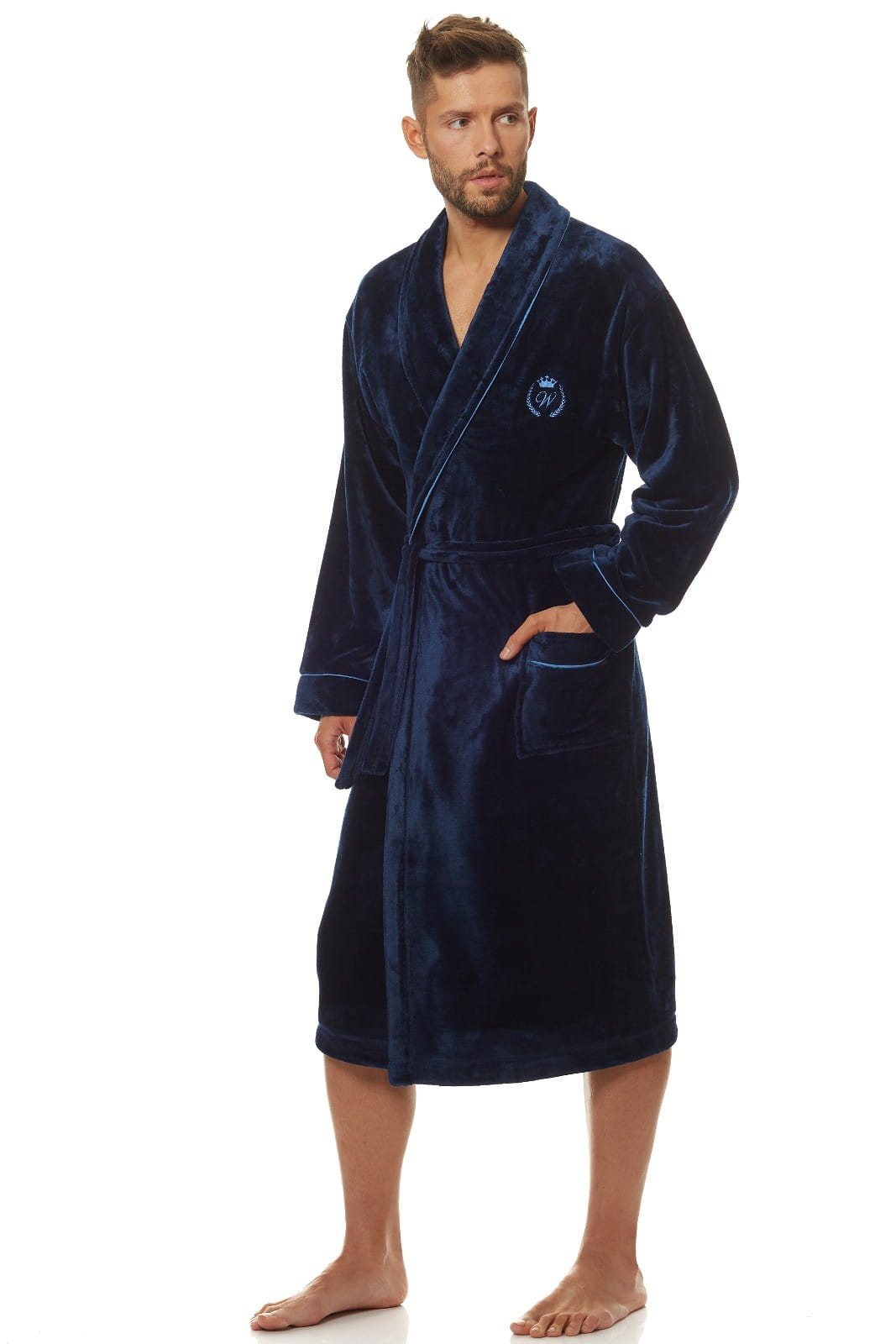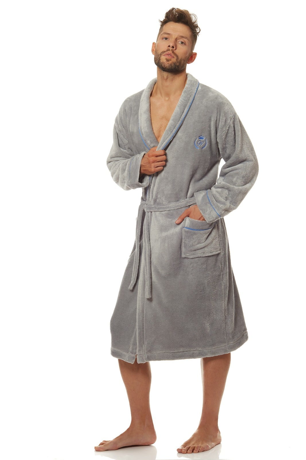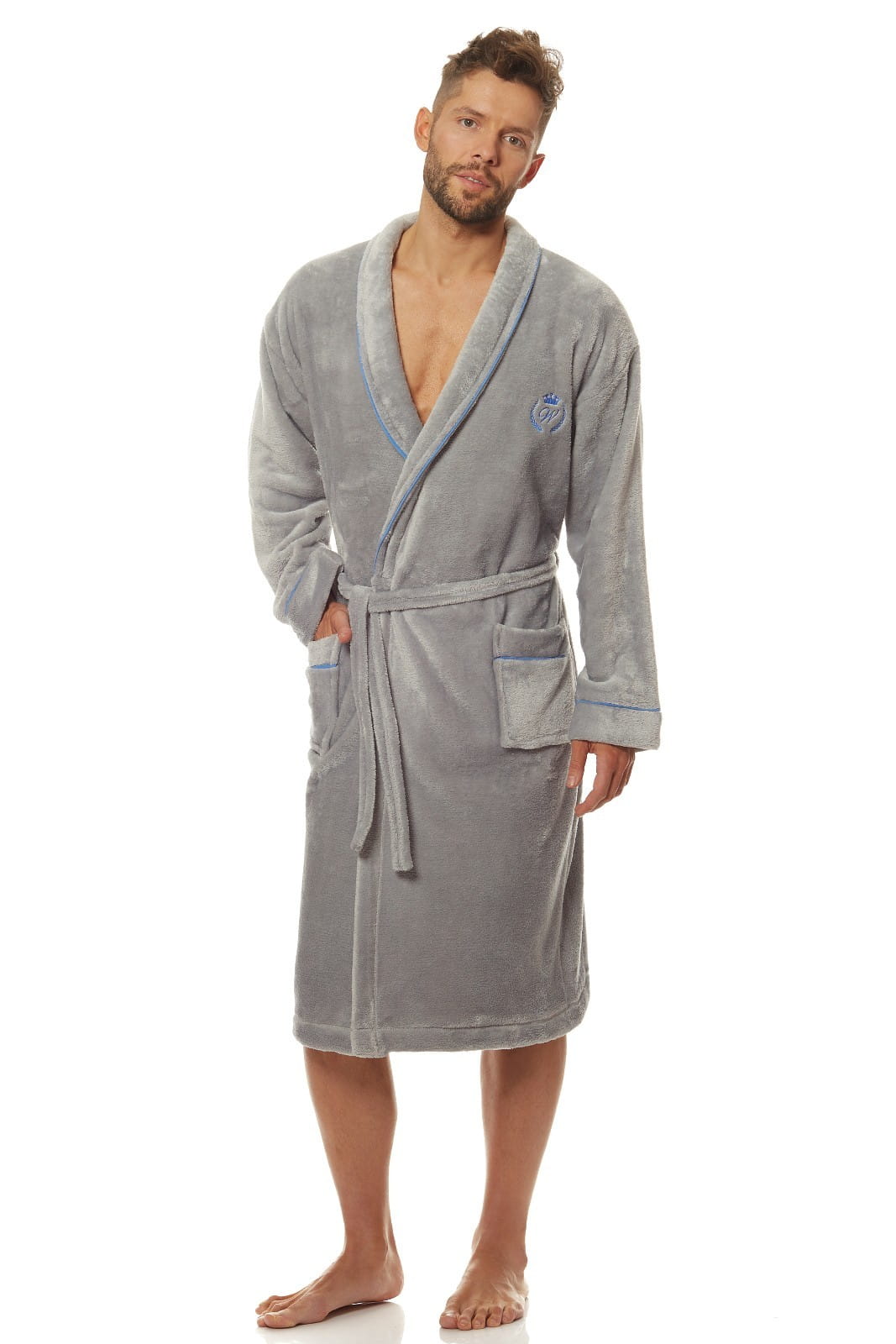 Klasyczny szlafrok męski - miła, miękka dzianina- szalowy kołnierz - wykończony wypustką w kontrastującym kolorze- na wysokości klatki piersiowej ozdobny haft- wiązany w pasie- na biodrach wygodne kieszenieSkład: 100% poliester.