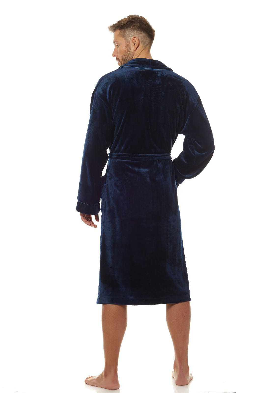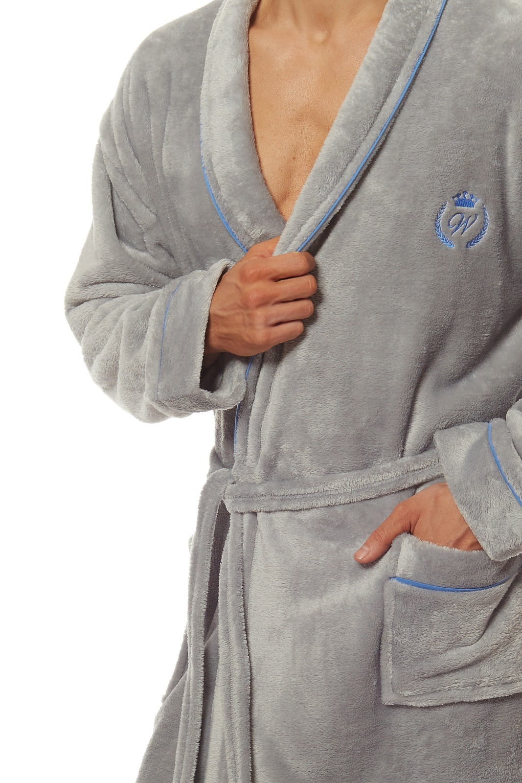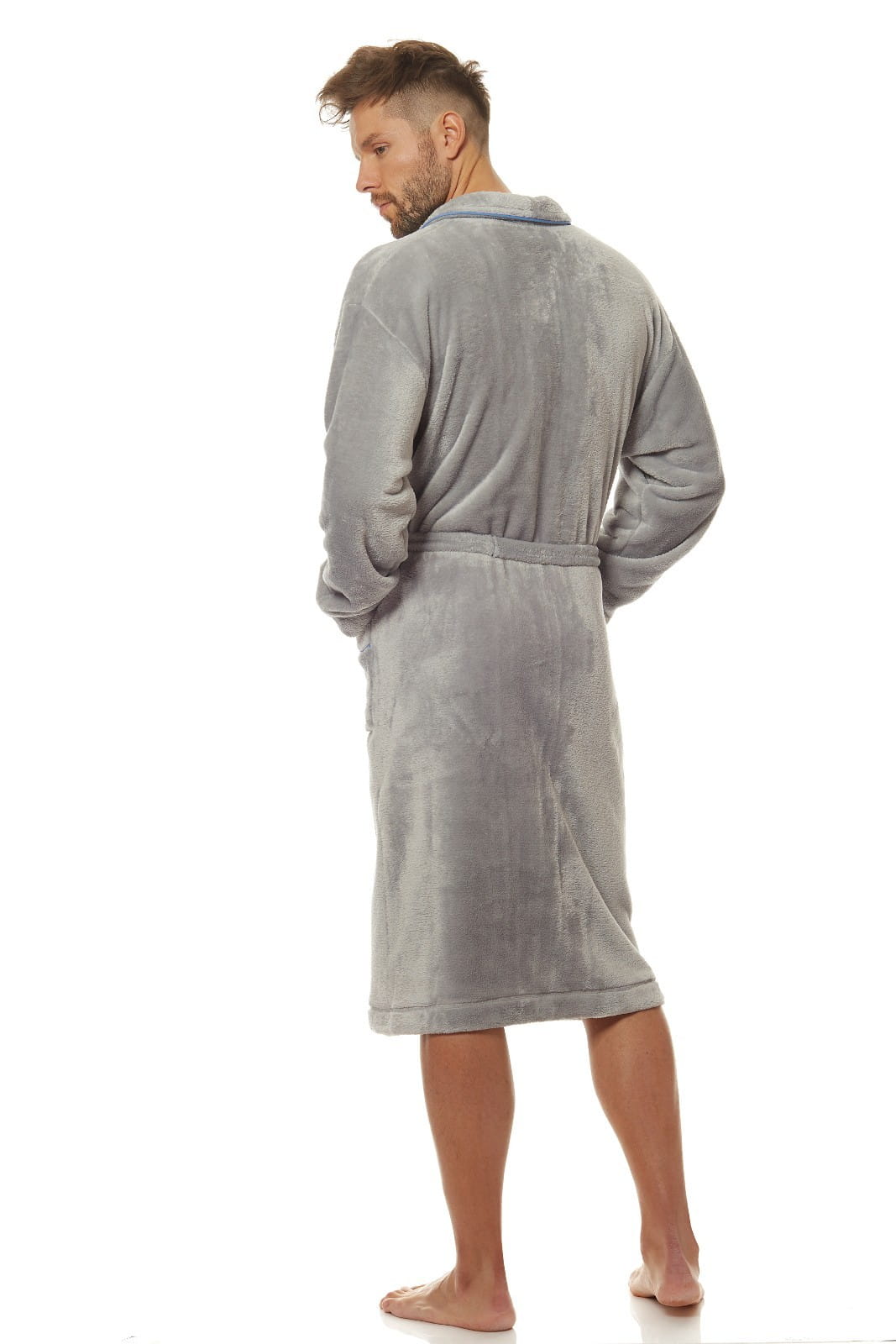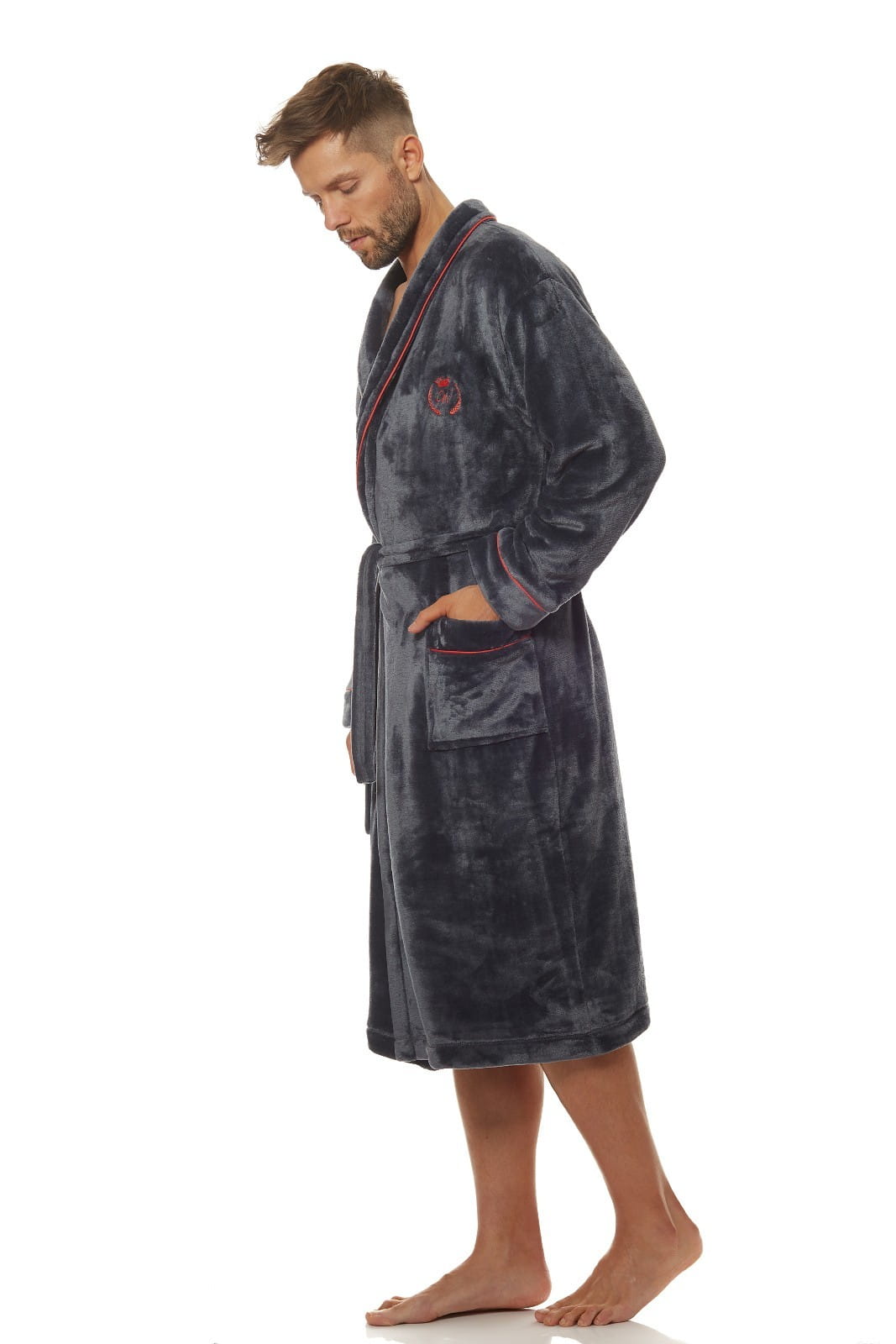 Klasyczny szlafrok męski - miła, miękka dzianina- szalowy kołnierz - wykończony wypustką w kontrastującym kolorze- na wysokości klatki piersiowej ozdobny haft- wiązany w pasie- na biodrach wygodne kieszenieSkład: 100% poliester.
