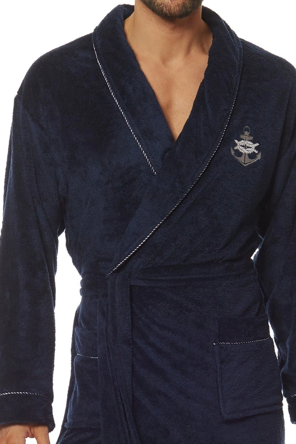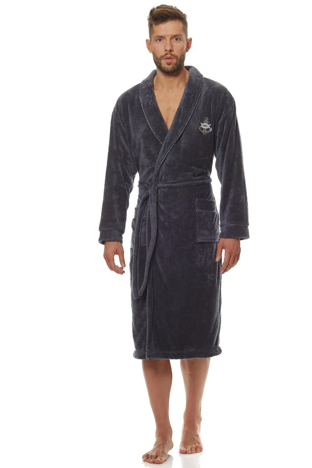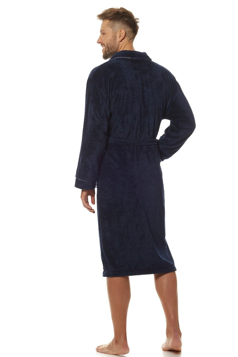 Szlafrok męski- kołnierz szalowy- miła i miękka dzianina- wiązany w pasie- mankiety i kołnierz obszyte nitką w kontrastującym kolorze - na biodrach wygodne kieszenie Skład: 100% poliester .